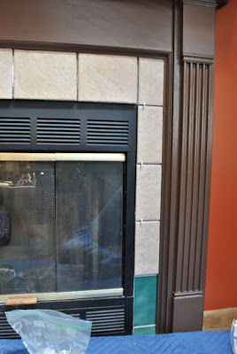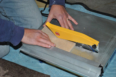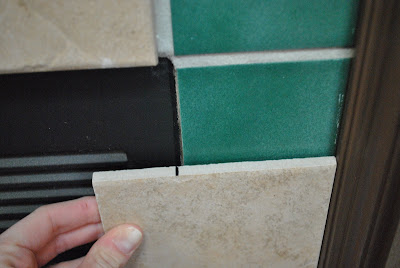 For the tile border, I started with the corner pieces because they had to be cut on a 45 degree angle. I measured and cut the two pieces using a wet saw and then worked my way up vertically and over horizontally.