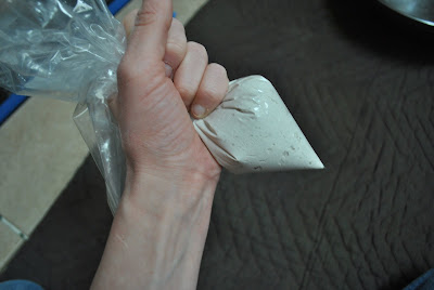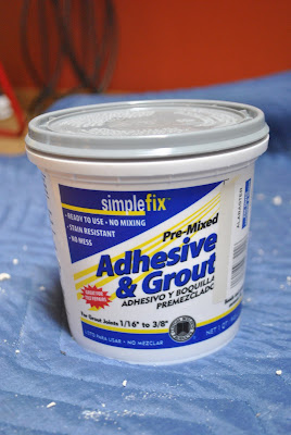 Then it was time to grout. After mixed + made the grout mixture, I put it in a ziploc bag and cut one corner creating a small hole for the grout to come out of. Kind of like icing a cake… Then I worked the grout into the cracks & crevices.