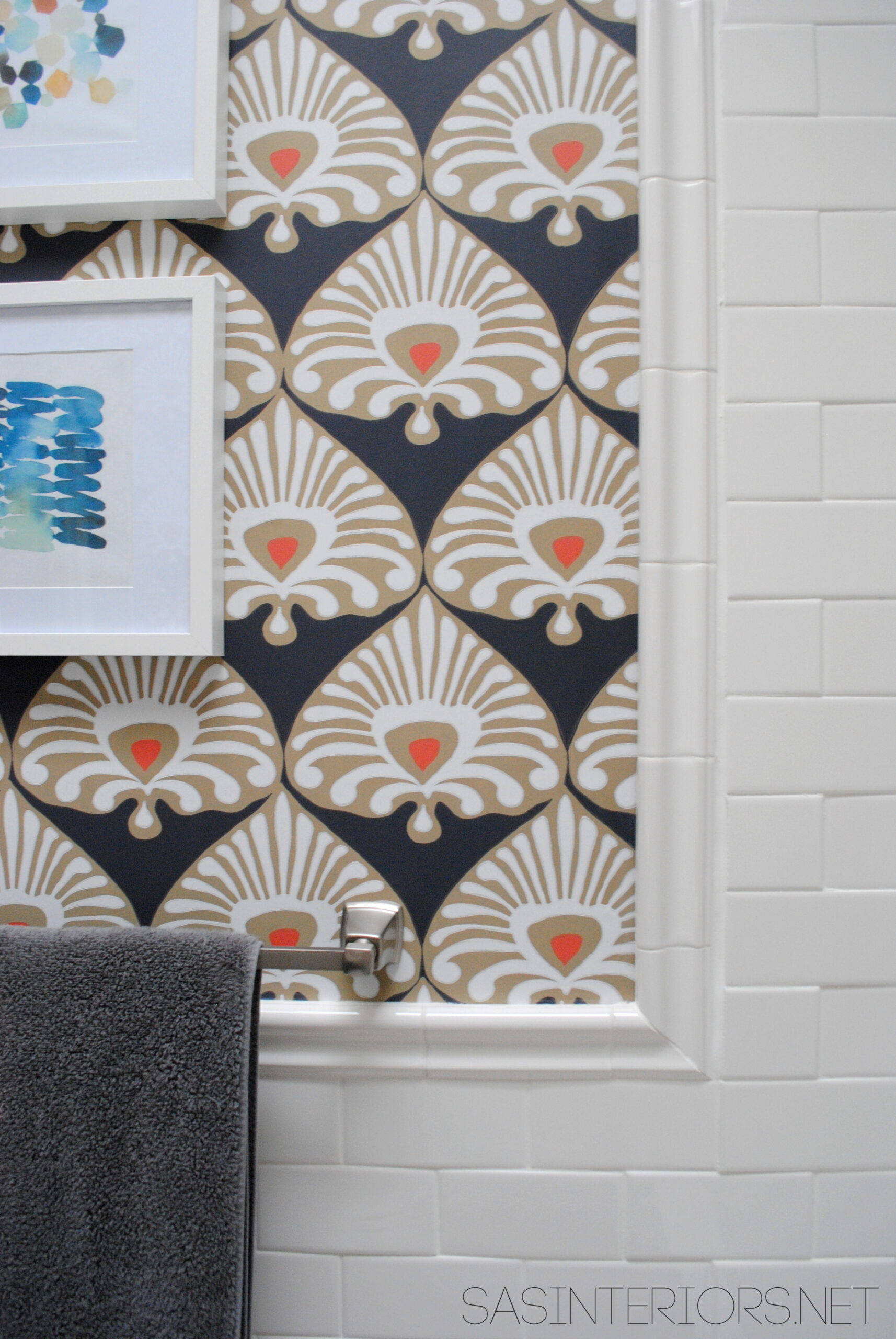 The tile accent border is truly a beautiful addition. Not only did it hide a lot of little mistakes and imperfect spots, but it has given this bathroom such an elegant + sophisticated finished look. I am so happy that I installed the wallpaper before adding the border because it has really given a nice clean edge. If / when I ever want to remove the wallpaper, my plan would be to score the edge of the accent tile with a sharp blade and then peel the paper off.